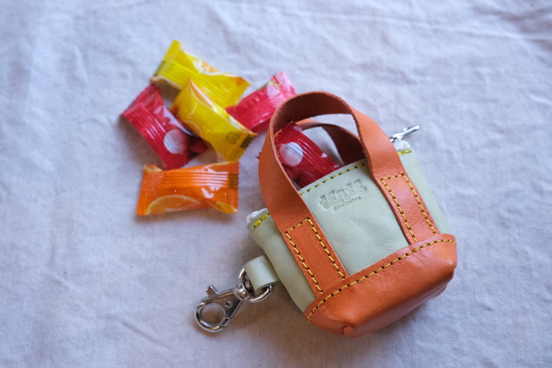 トートバッグ型のミニキーホルダーを作りました。小銭や飴玉や目薬などなど入ります。何を入れるかはあとのお楽しみになってしまいそうですが、とにかく見た目がキュートです。
