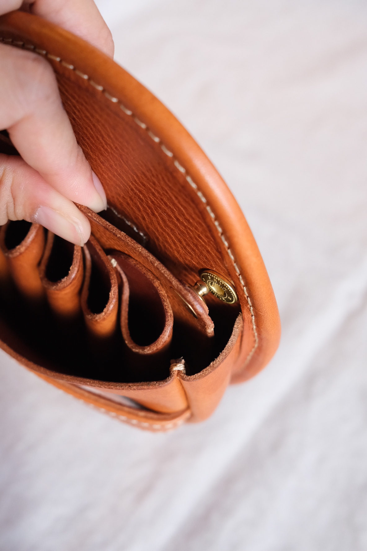 TENTEで使用している革は、イタリアのサンタクローチェにある老舗のタンナーが1枚ずつ手作業でなめしたバケッタ製法で作られた革です。食肉加工の過程からうまれている原皮を使用しており、オイルをたっぷり含んだ植物タンニンなめしの革は、使い込むほどに色艶が美しく、経年変化をお楽しみいただける革になっています。