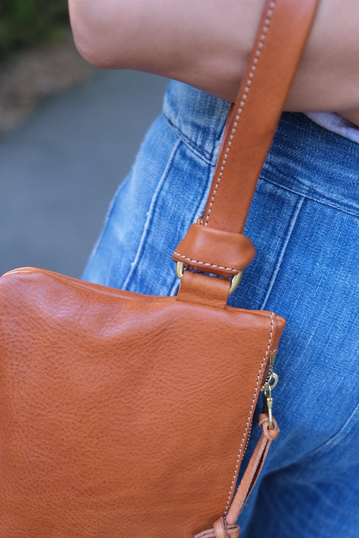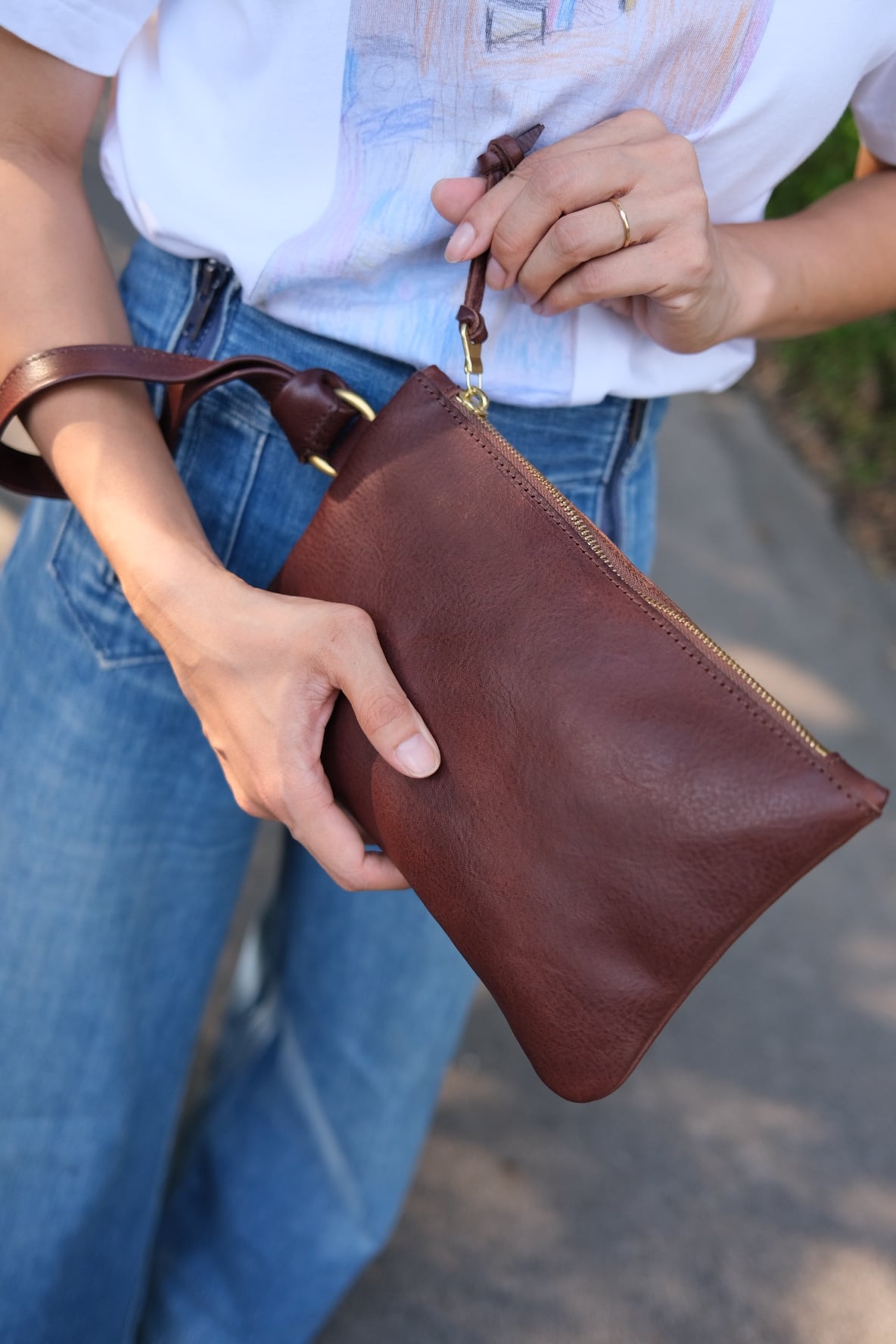 オイルレザーを使用。革の厚みを落として、モノの入れやすさ、軽さ、手持ちでクシャッと馴染む感じをイメージして作りました。歳を重ねてもカッコよく使えそうな気がします。