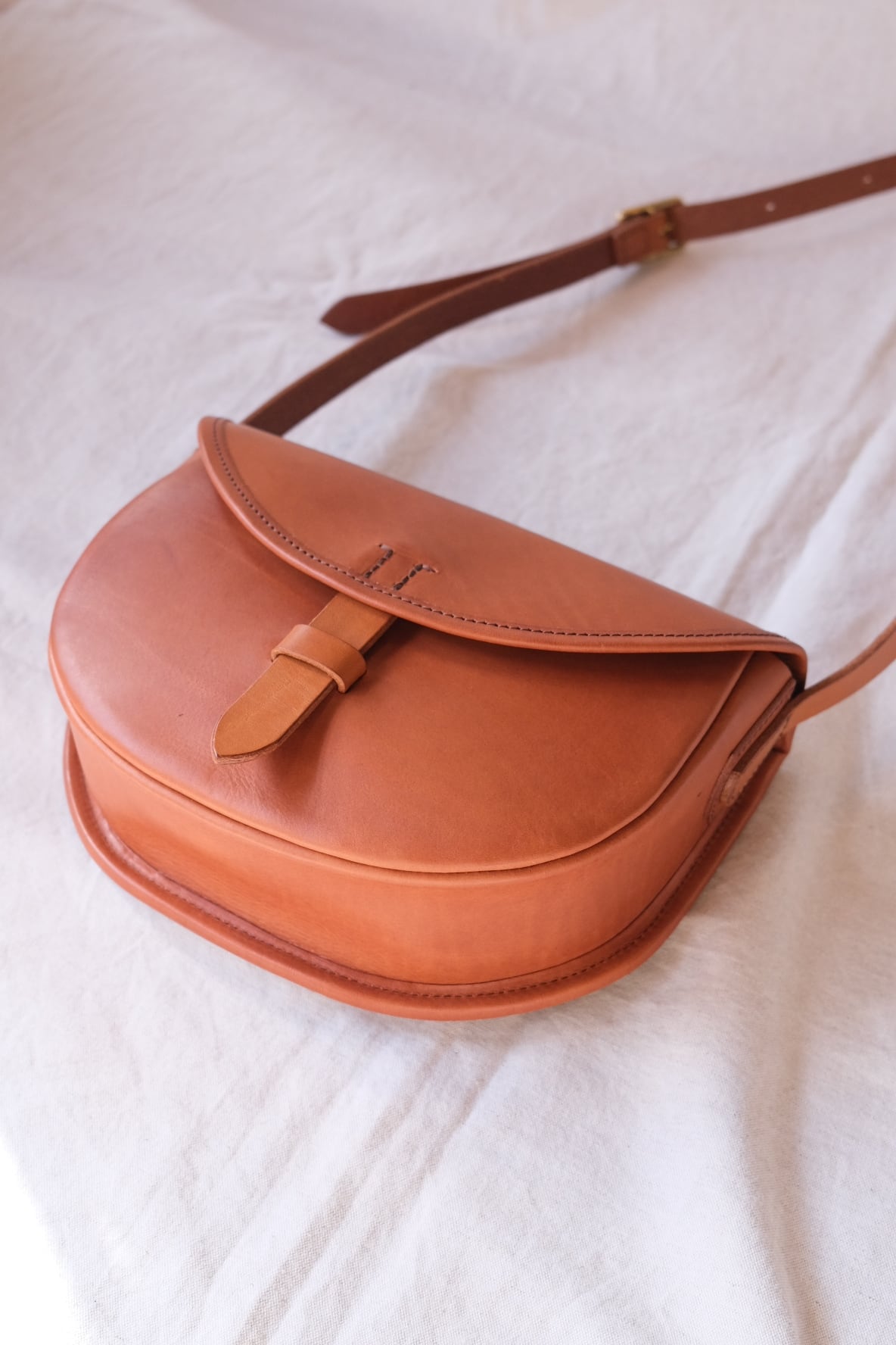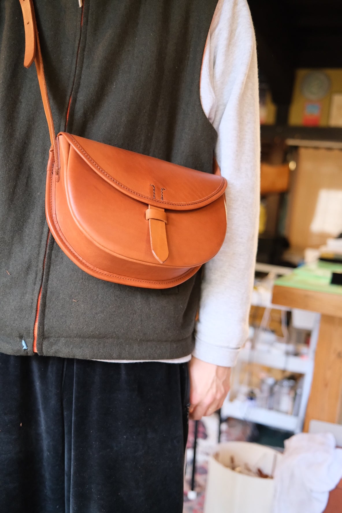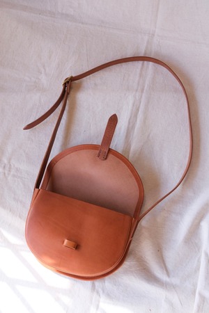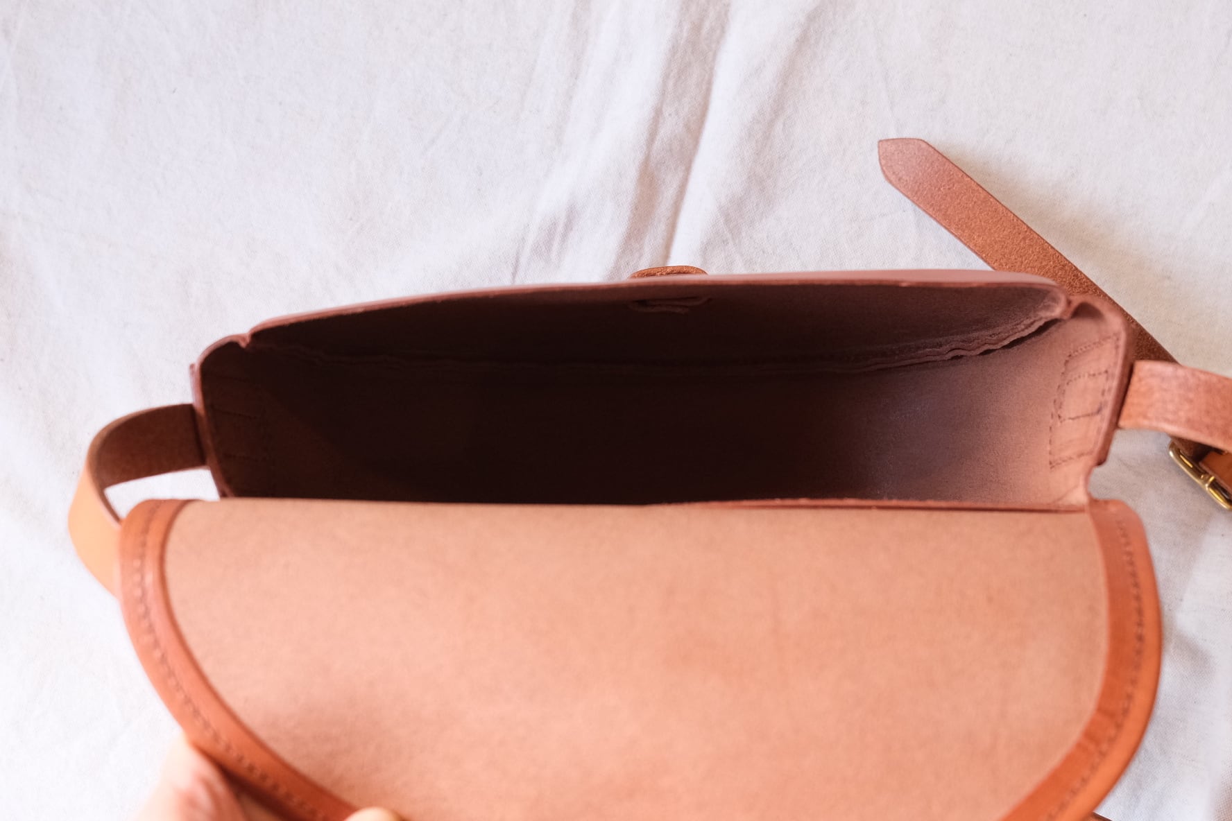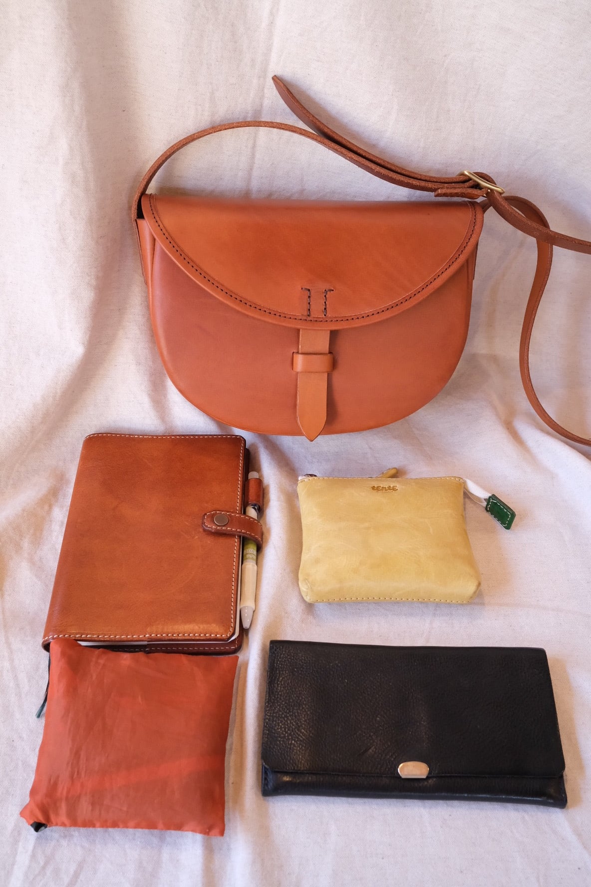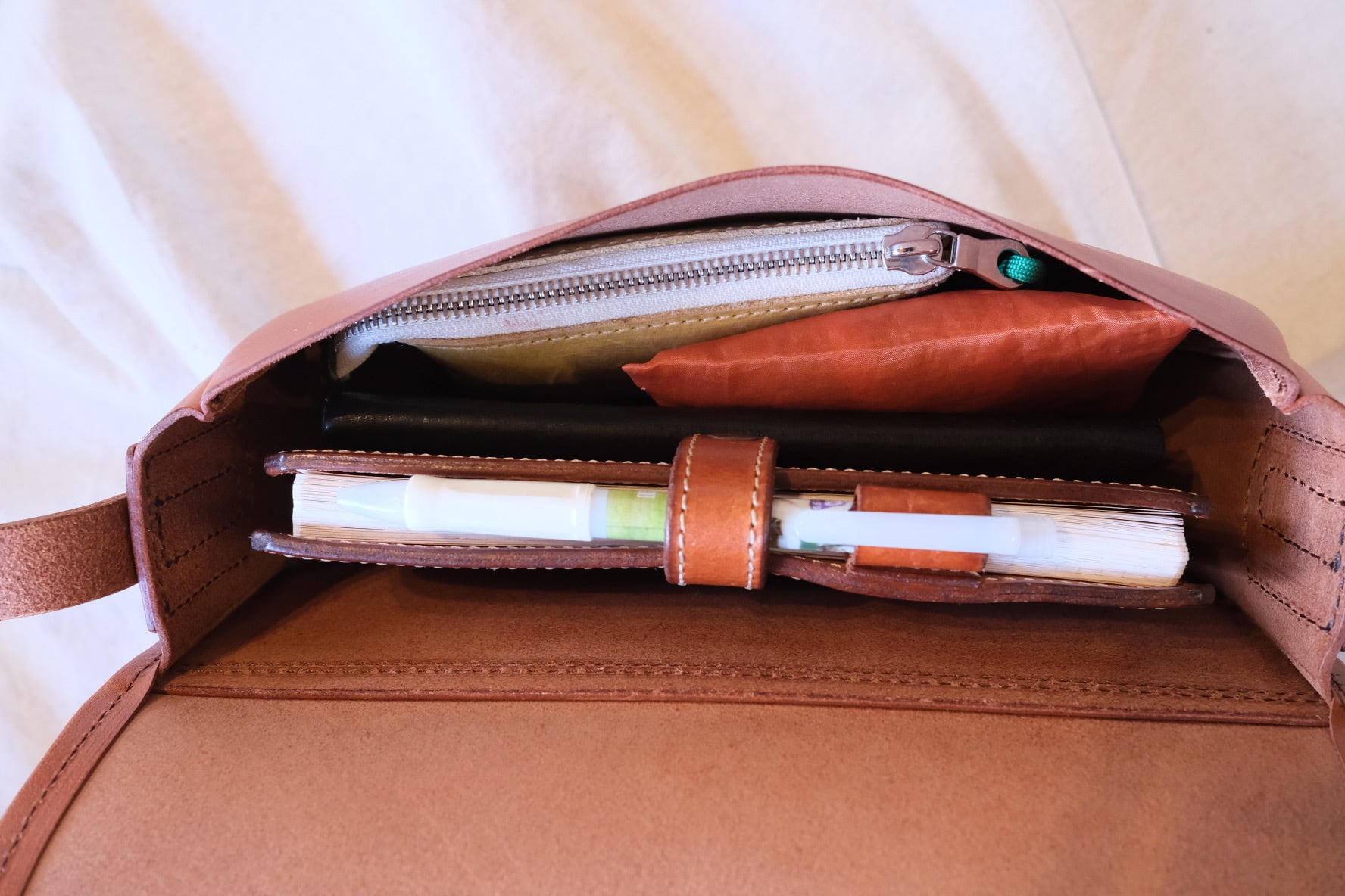 ハリのあるブラウンの革とも相性が良く、丸みのある綺麗なフォルムがでました。マチがしっかりあるので普段使うものはだいたい入るかと思います。B6サイズの手帳もぴったり入りました。