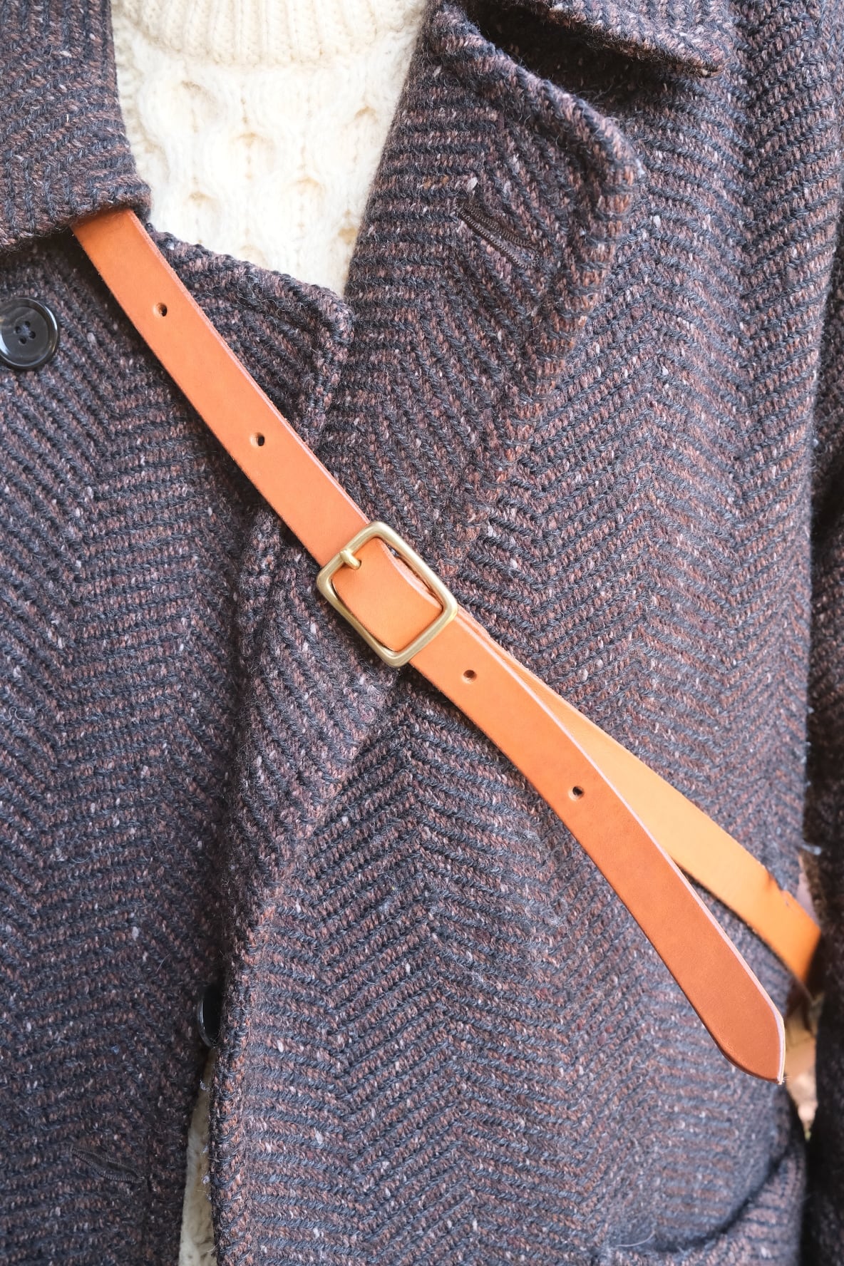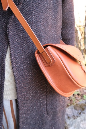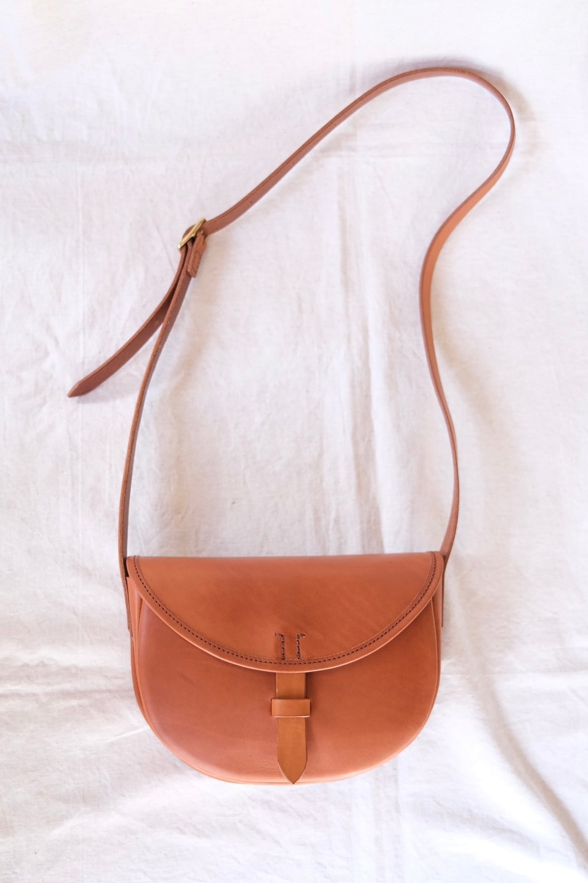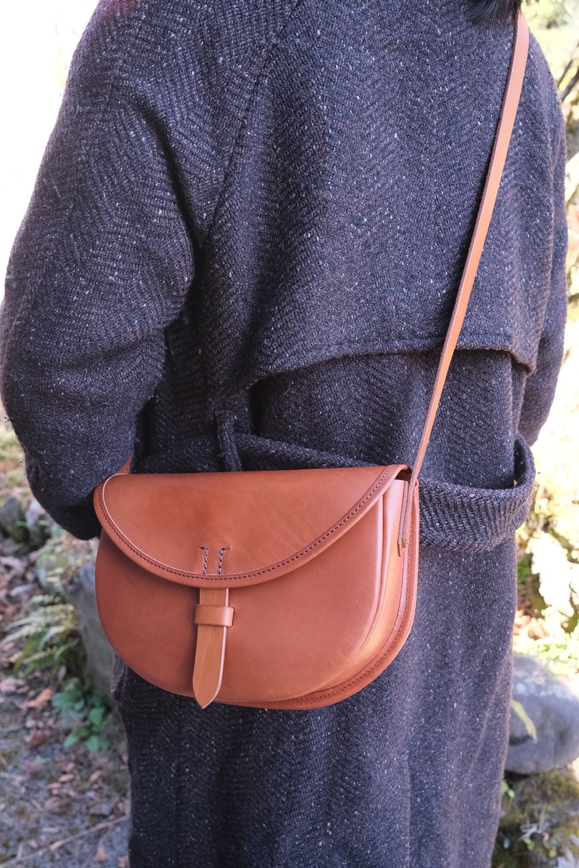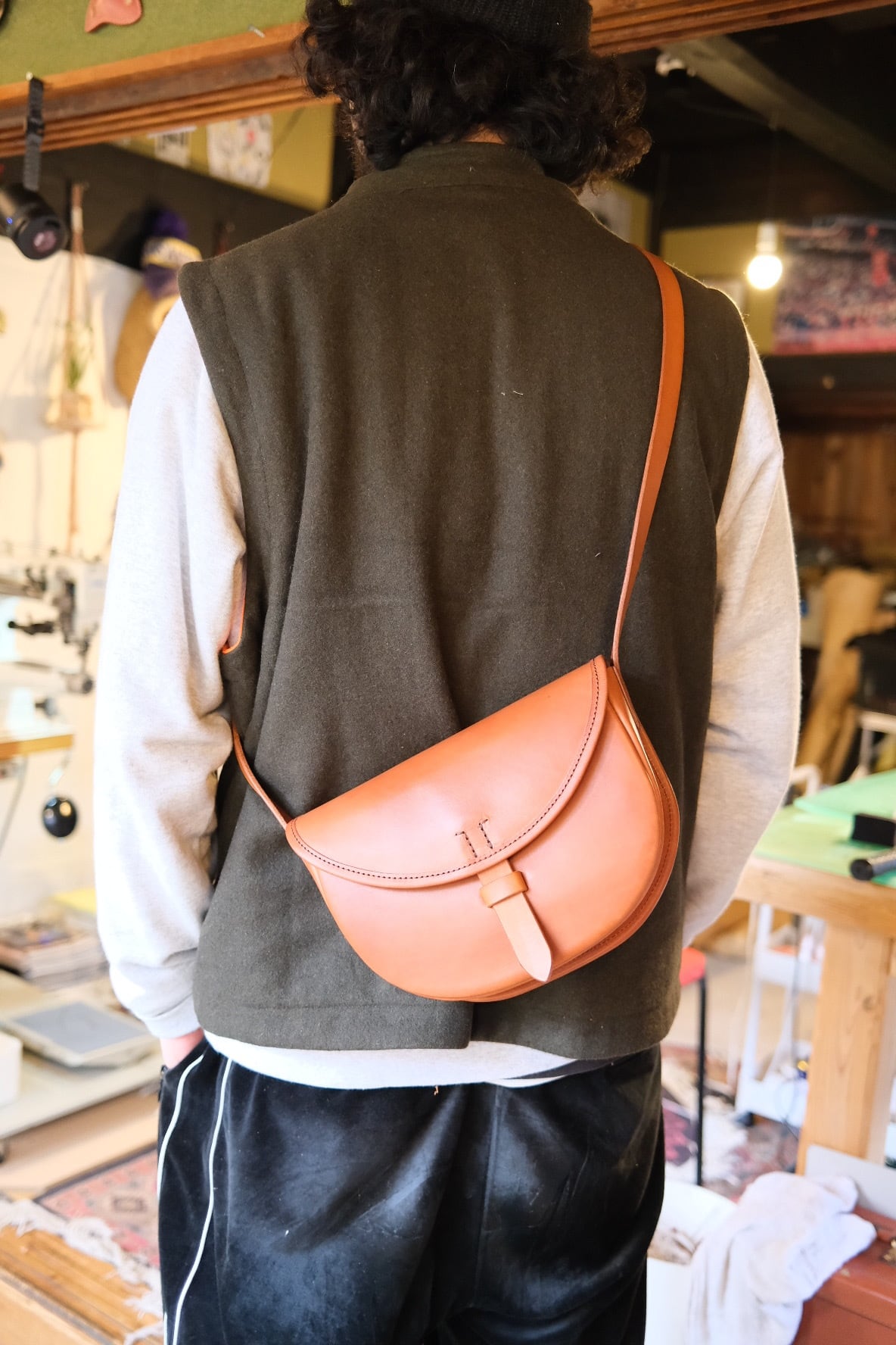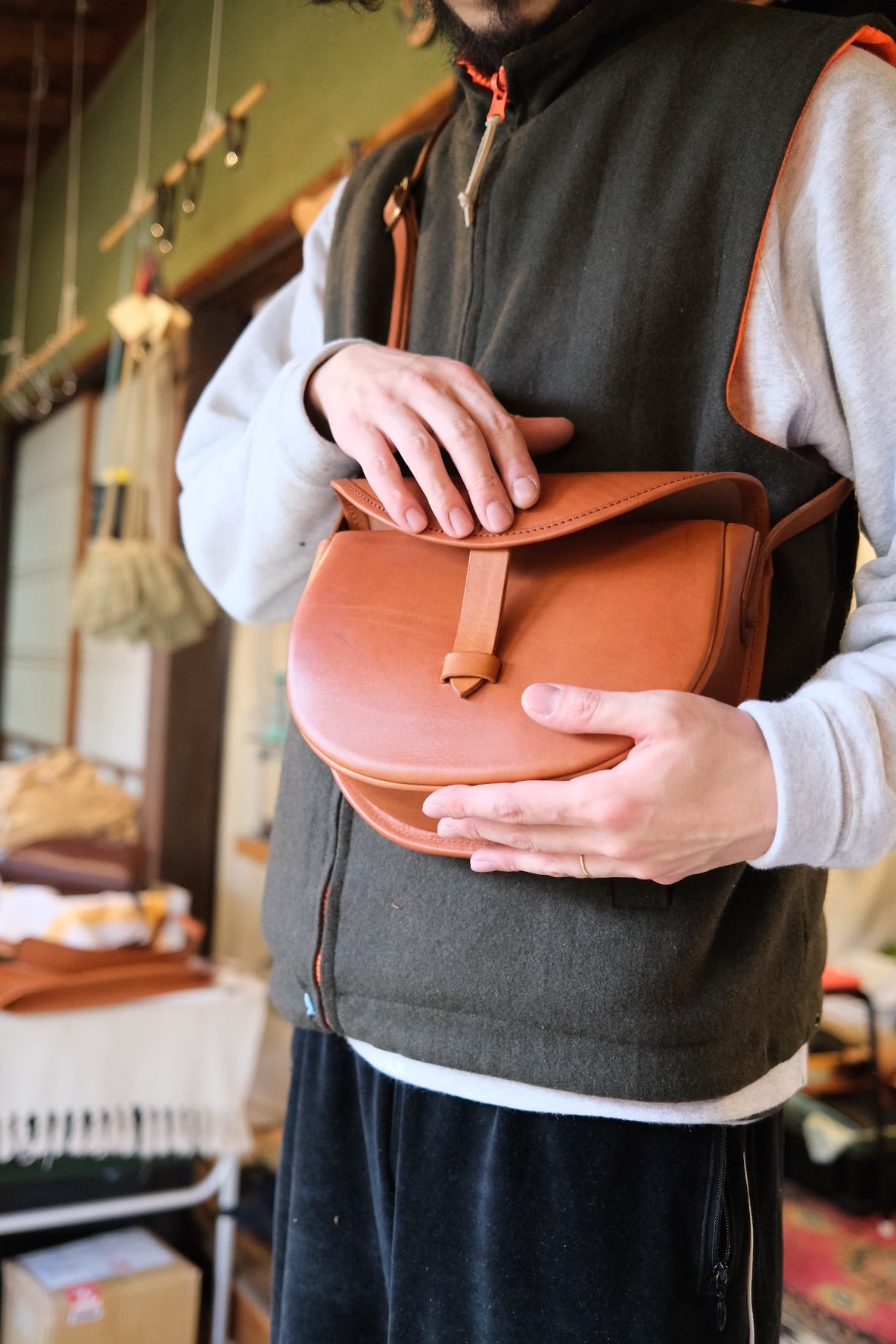 60年代ぐらいまで使用されていたポストマン用のメールバッグをイメージに、鞄本体には金具を使わず、背面にはシンプルなポケットをつけました。腰あたりに鞄がくるとバランスが良さそうです。