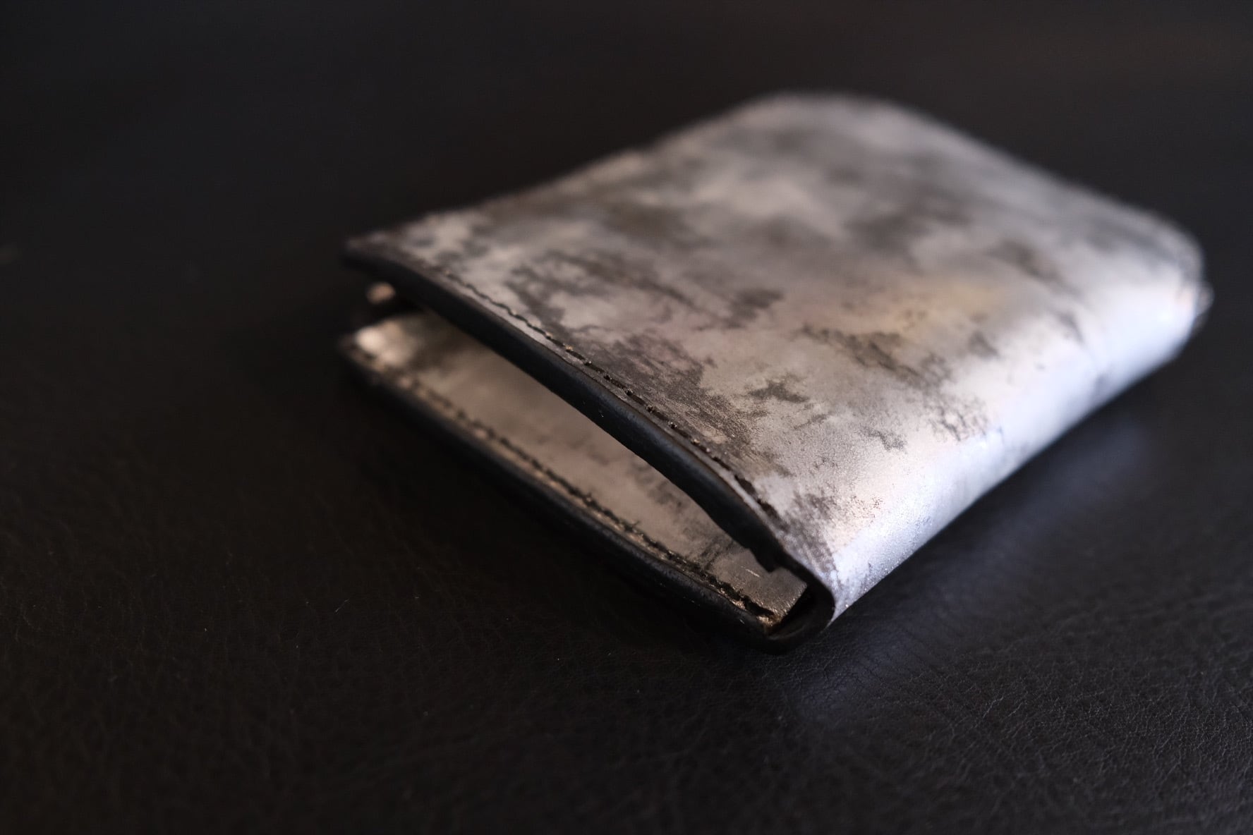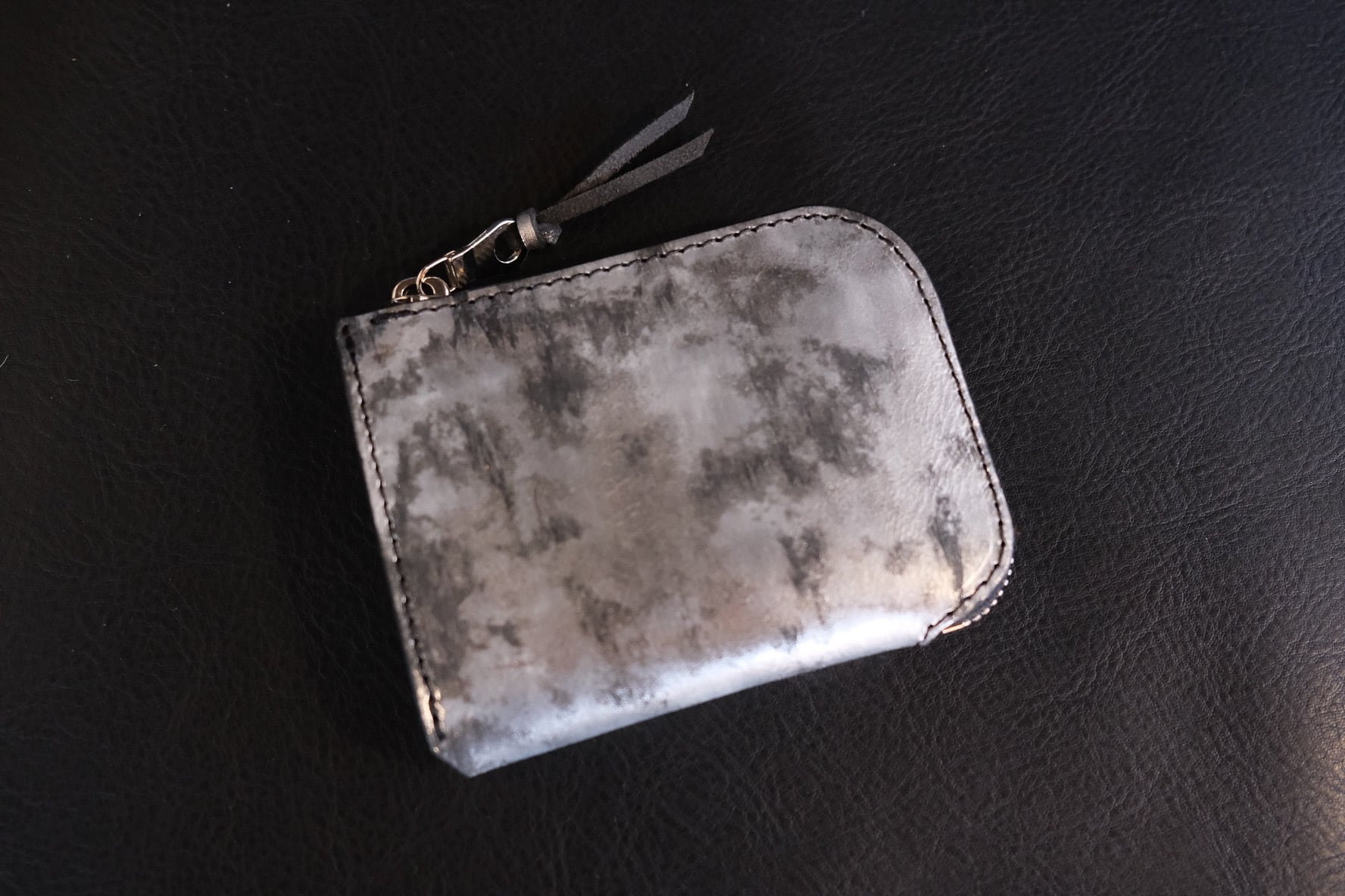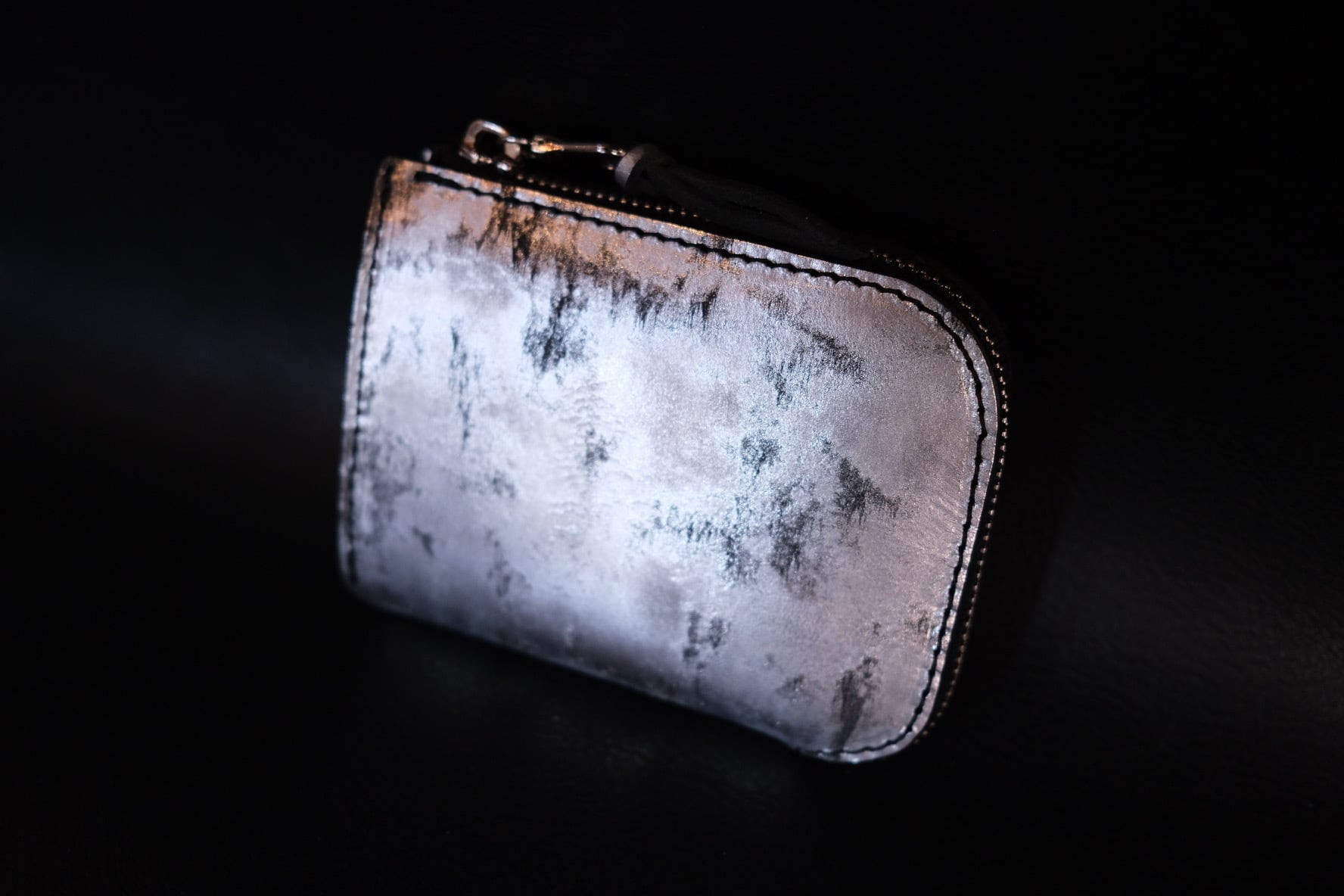 表面に箔を施したフルベジタブルタンニンレザー。下地カラーはブラック。