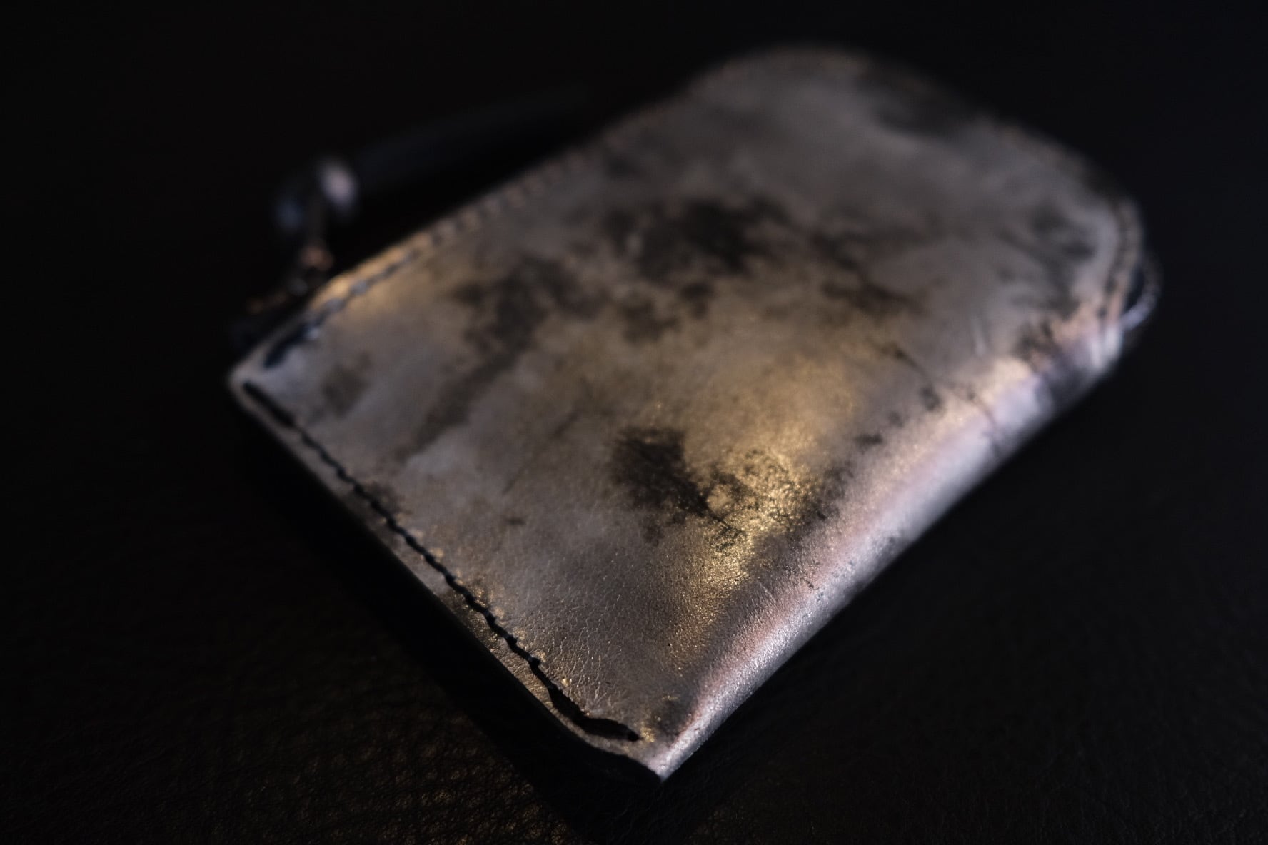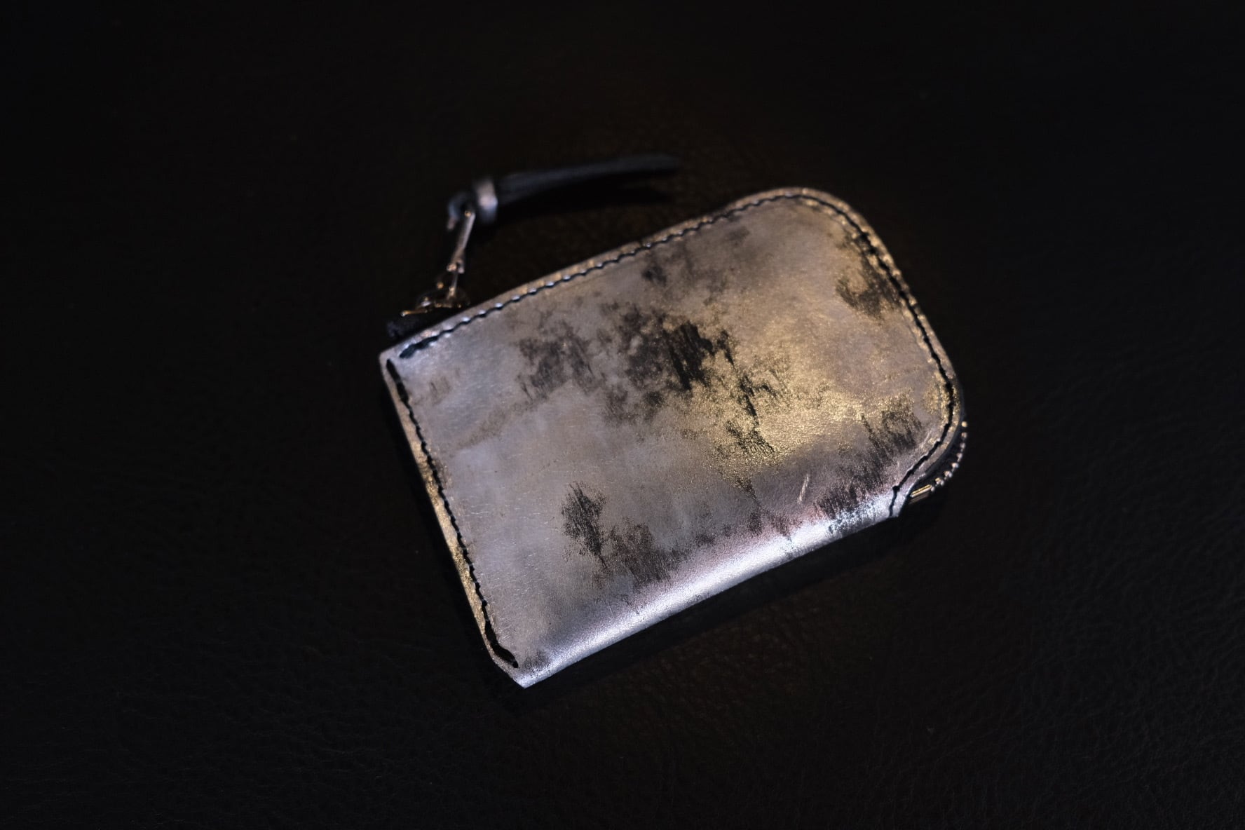 表面に箔を施したフルベジタブルタンニンレザー。下地カラーはブラック。