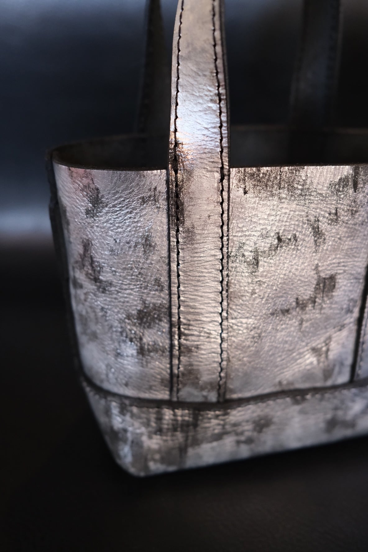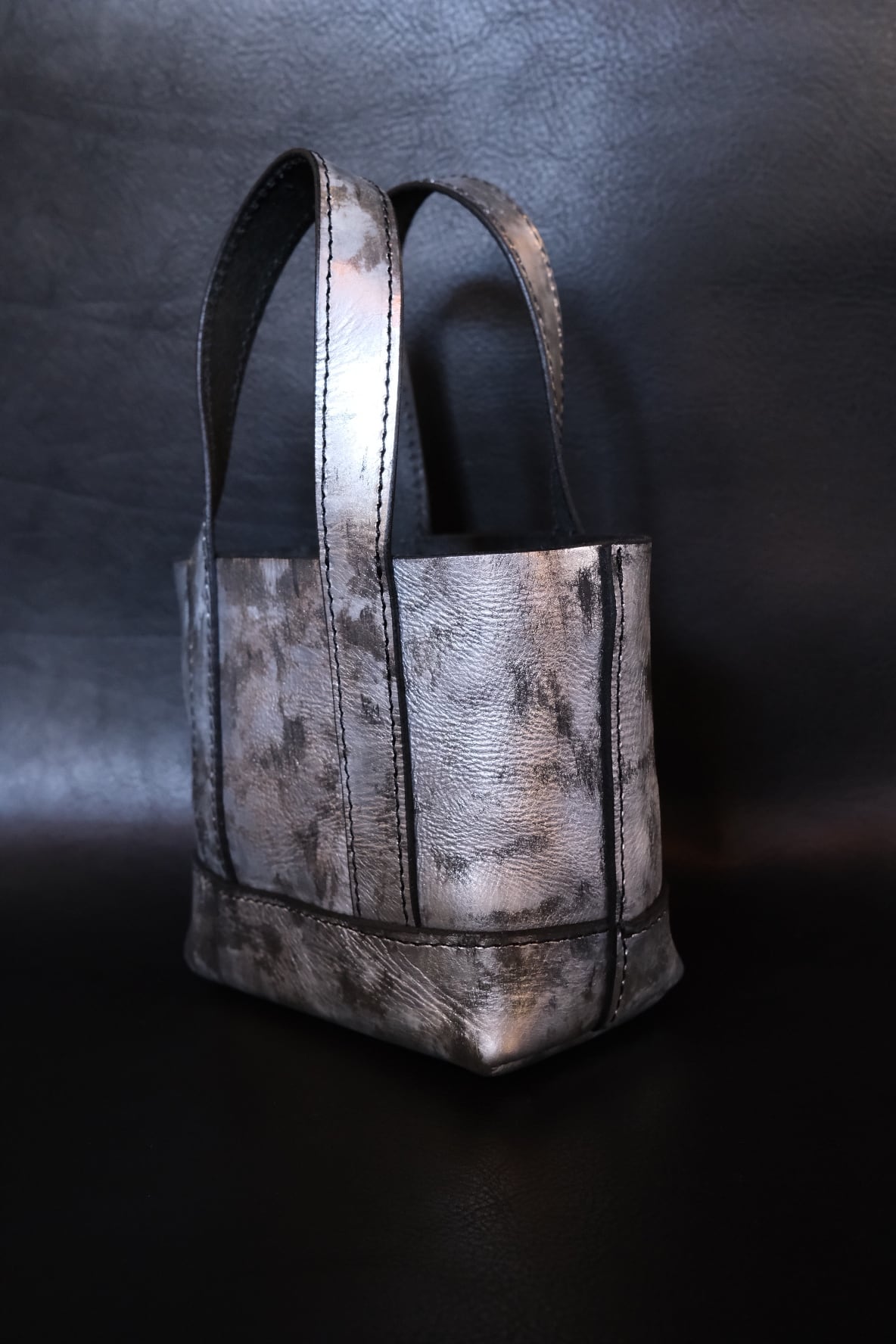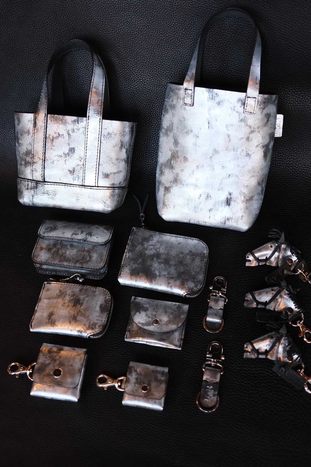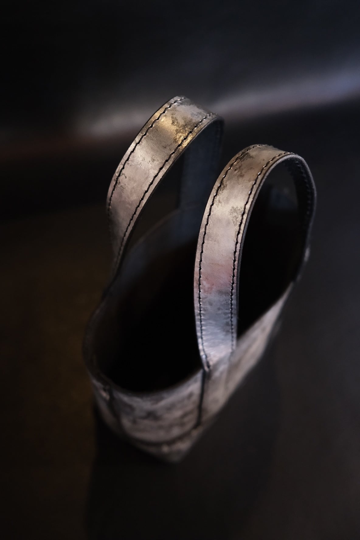 表面に箔を施したフルベジタブルタンニンレザー。下地カラーはブラック。