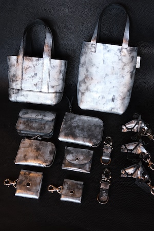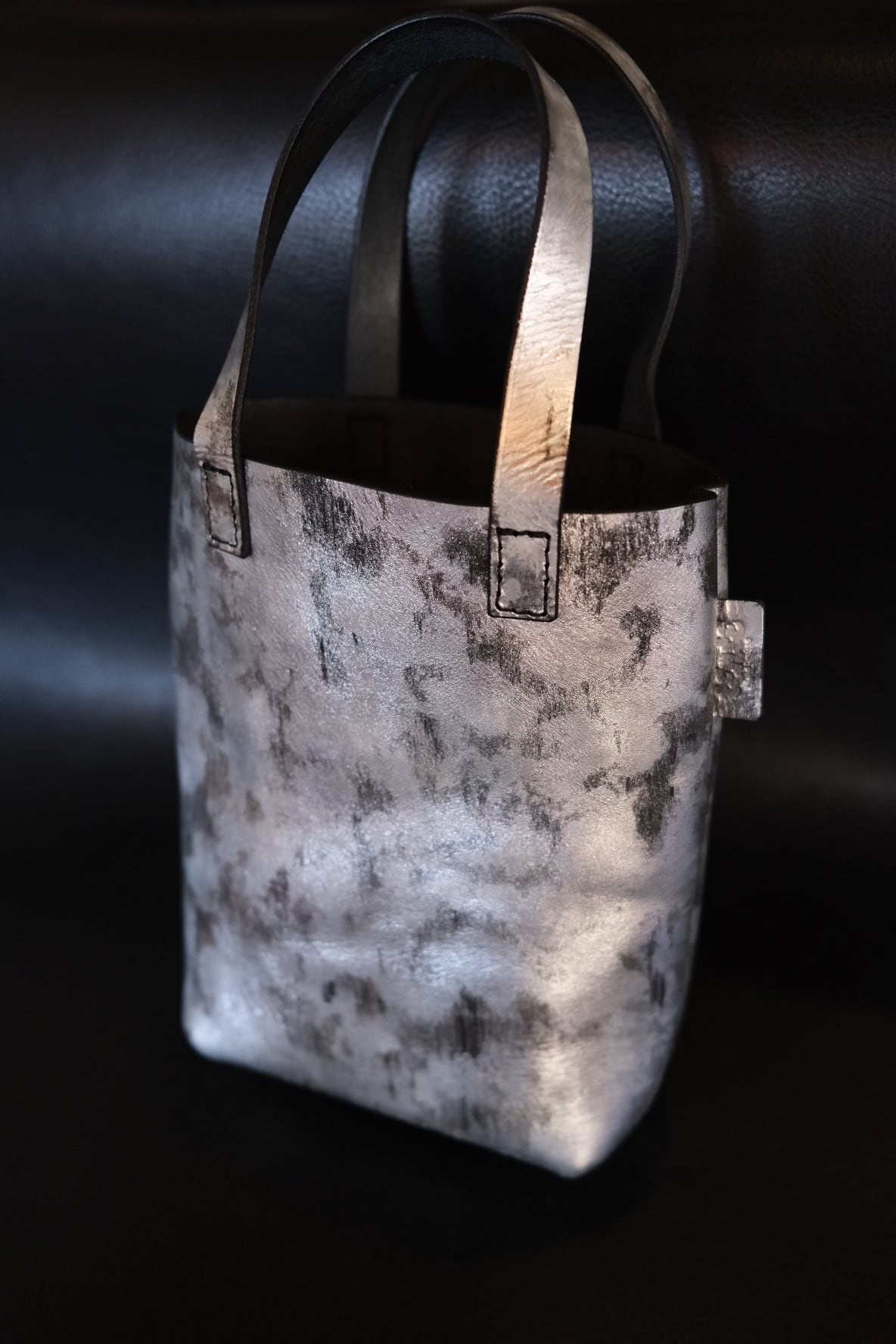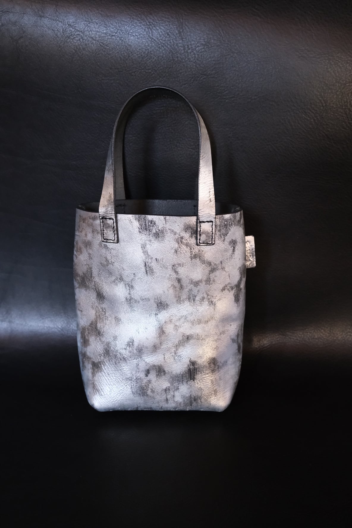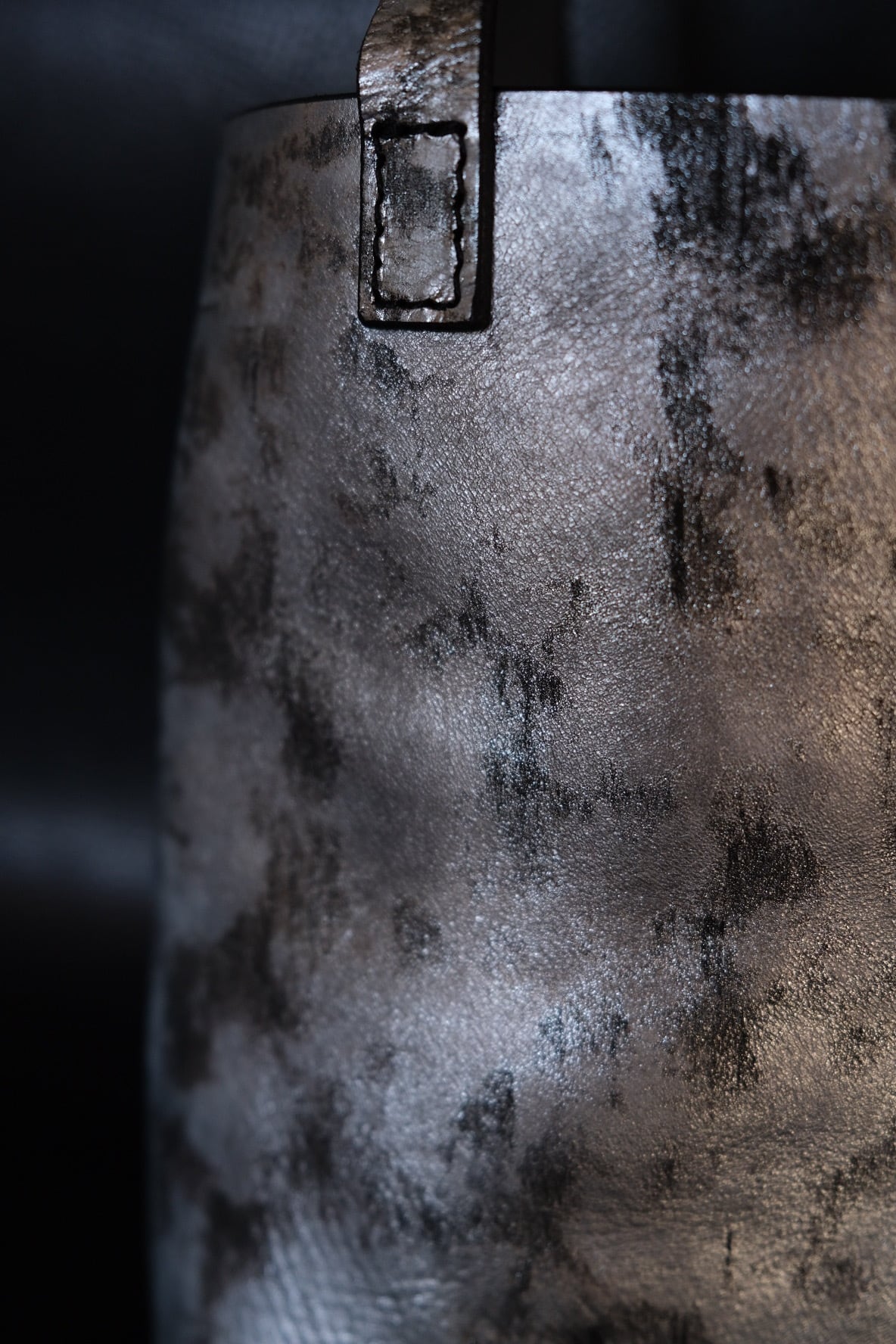 表面に箔を施したフルベジタブルタンニンレザー。下地カラーはブラック。