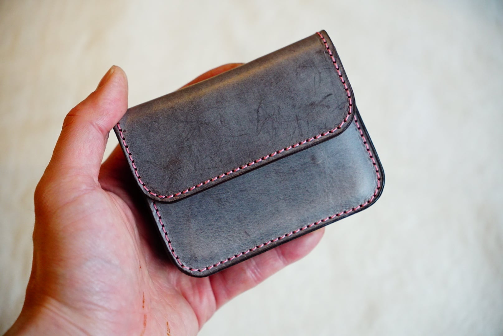 牛一頭一頭個性がある通り、革本来のキズ やシワ、色のムラなどの個体差がある場合があります。また、水に弱いことも特性の一つのため、服などへの色移りにはご注意下さい。