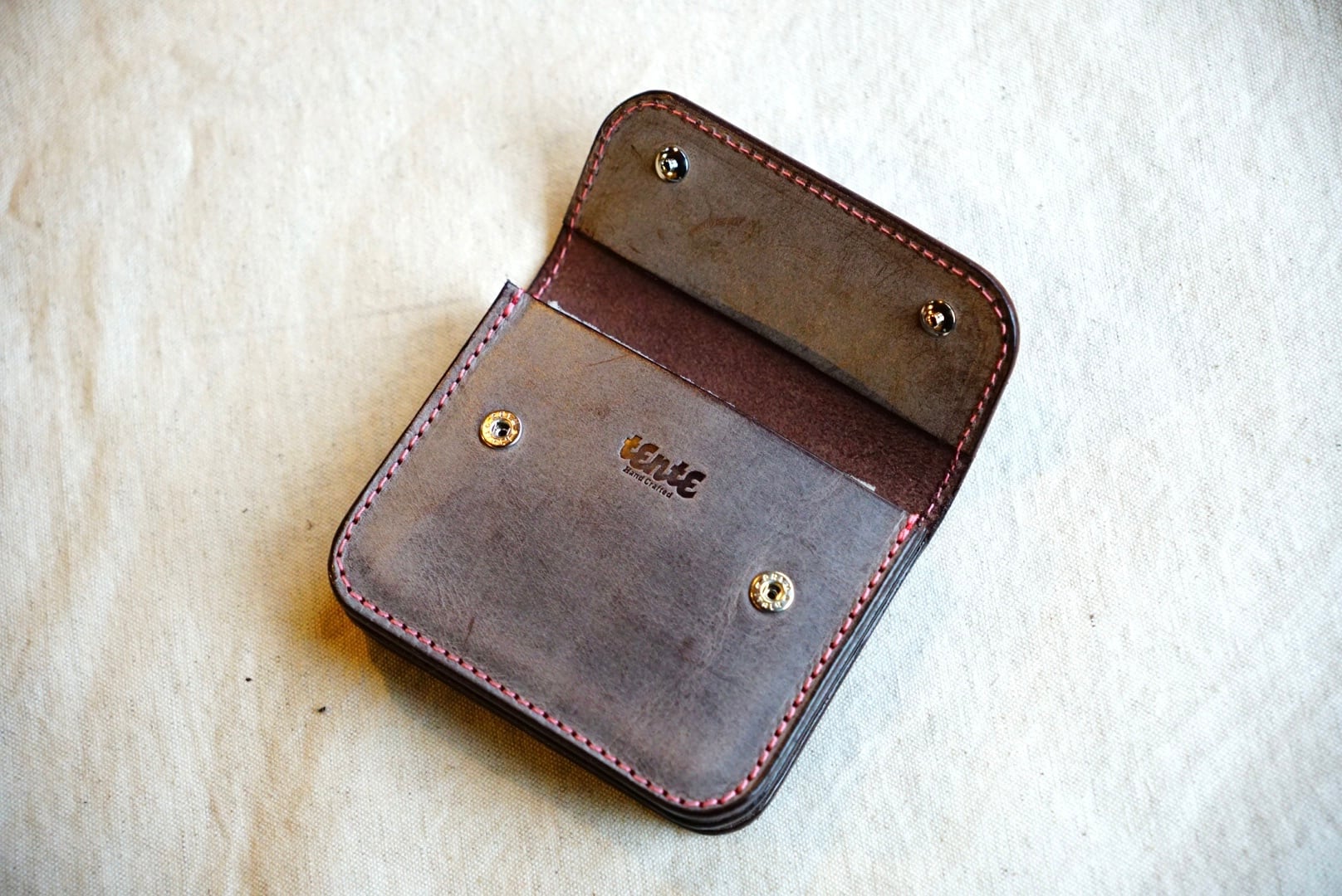 TENTEで使用している革は、イタリアのサンタクローチェにある老舗のタンナーが1枚ずつ手作業でなめしたバケッタ製法で作られた革です。食肉加工の過程からうまれている原皮を使用しており、オイルをたっぷり含んだ植物タンニンなめしの革は、使い込むほどに色艶が美しく、経年変化をお楽しみいただける革になっています。