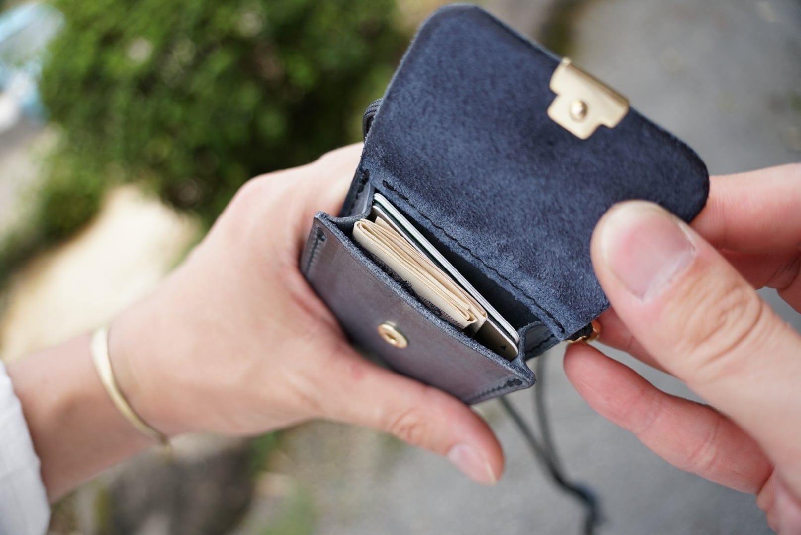 バタバタしちゃうレジでさっと取り出せるスリムなネックウォレット、とっても便利です。